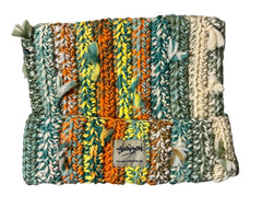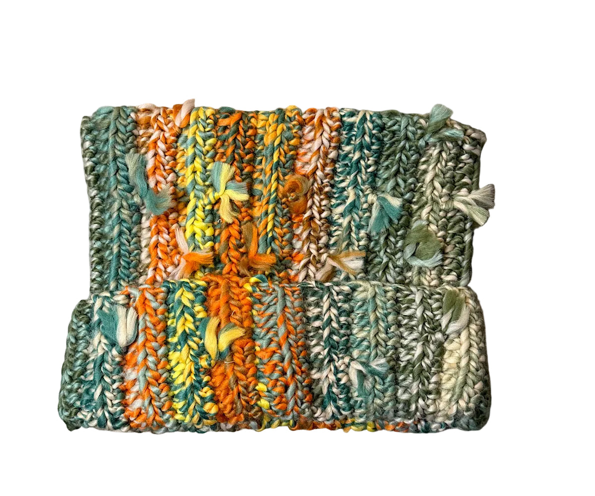 Hand-knit with rich earth-tone yarns in green, cream, orange, and yellow. Features textured stitching, subtle tassel details, and a premium Needlework label—heavyweight, warm, and one-of-a-kind.