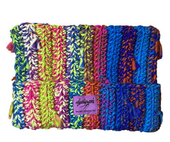 Hand-knit with vibrant, multicolor yarns and bold textured stitching. Finished with tassel details and a premium Needlework label—heavyweight, warm, and made to stand out