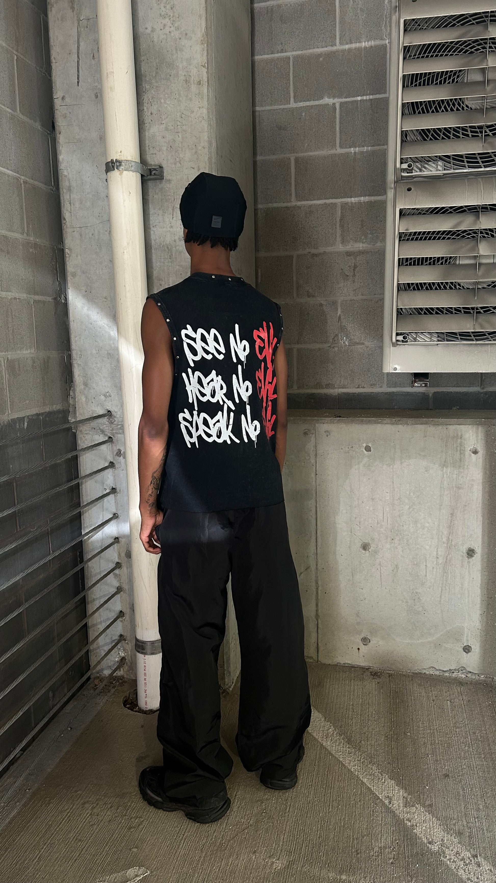 Expertly crafted with 240 gsm cotton, this sleeveless tee features stunning stud details on the sleeve and collar. With a bold and eye-catching jumbo print, the "See no evil" design is sure to make a statement. Stay cool and stylish in this unique and high-quality tee. Color is washed black
