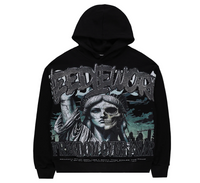 This 360 GSM hoodie features a bold front graphic of the Statue of Liberty with a half-skull design, symbolizing strength, freedom, and resilience in the face of fear. Across the top, it reads “NEEDLEWORK” in a distressed graffiti-style font, while the bottom states “FREEDOM OVER FEAR” in bold gothic lettering. Distressing on hood, pocket, and bottom of hoodie.